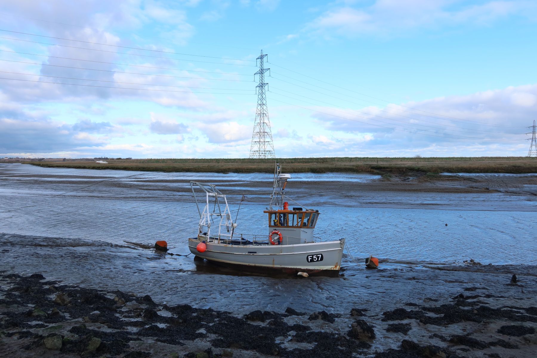 Across the creek, boats huddled around their moorings, becalmed on thick slopes of silt, perhaps wary of the small cluster of unwanted boats dumped next to our path. Little more than stripped shells, their hulls are now encrusted with lichen, their colour fading into the landscape.